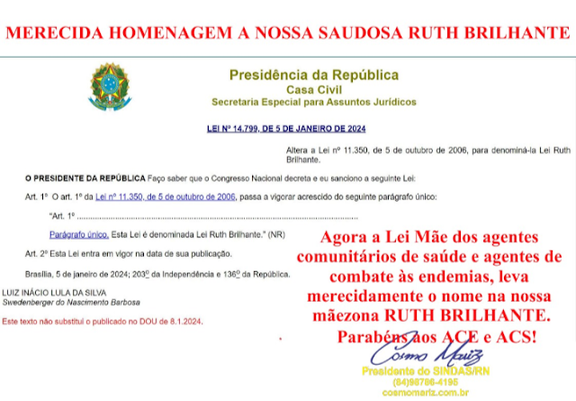 A LEI Nº 14.799. DE 5 DE JANEIRO DE 2024 Altera a Lei nº 11.350, de 5 de outubro de 2006, para denomina-la Lei Ruth Brilhante. Merecida homenagem!